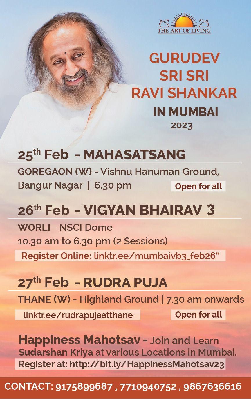 To get the latest updates about all the events in the run up-to Gurudev’s visit to Mumbai (Including after Gurudev arrives in Mumbai), please join our Whatsapp group: